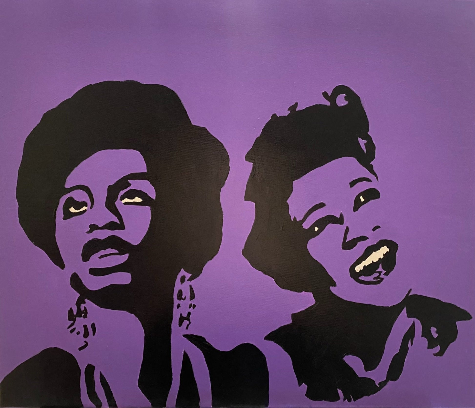 This painting is an 20x24 on canvas. The two people you see are two artist from two different eras. (Nina Simone and Ella Fitzgerald. This is also available in 11x14 prints. We are down to just 2 prints which are only $35!
